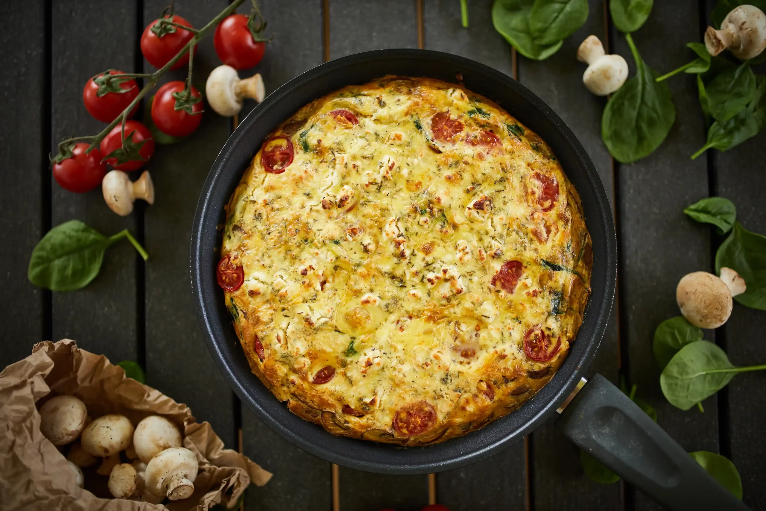 Eier und Milch in einer Schüssel mit dem Schneebesen (od. Gabel) verquirlen und mit Salz & Pfeffer würzen. Die Ei-Masse in eine gefettete Auflaufform/Pfanne geben und das Gemüse (Spinat, Champignons & Tomatenstücke) ergänzen. Zu guter Letzt den Feta zerbröseln und drüberstreuen. Nun geht’s für ca. 15-20 Minuten in den Ofen.