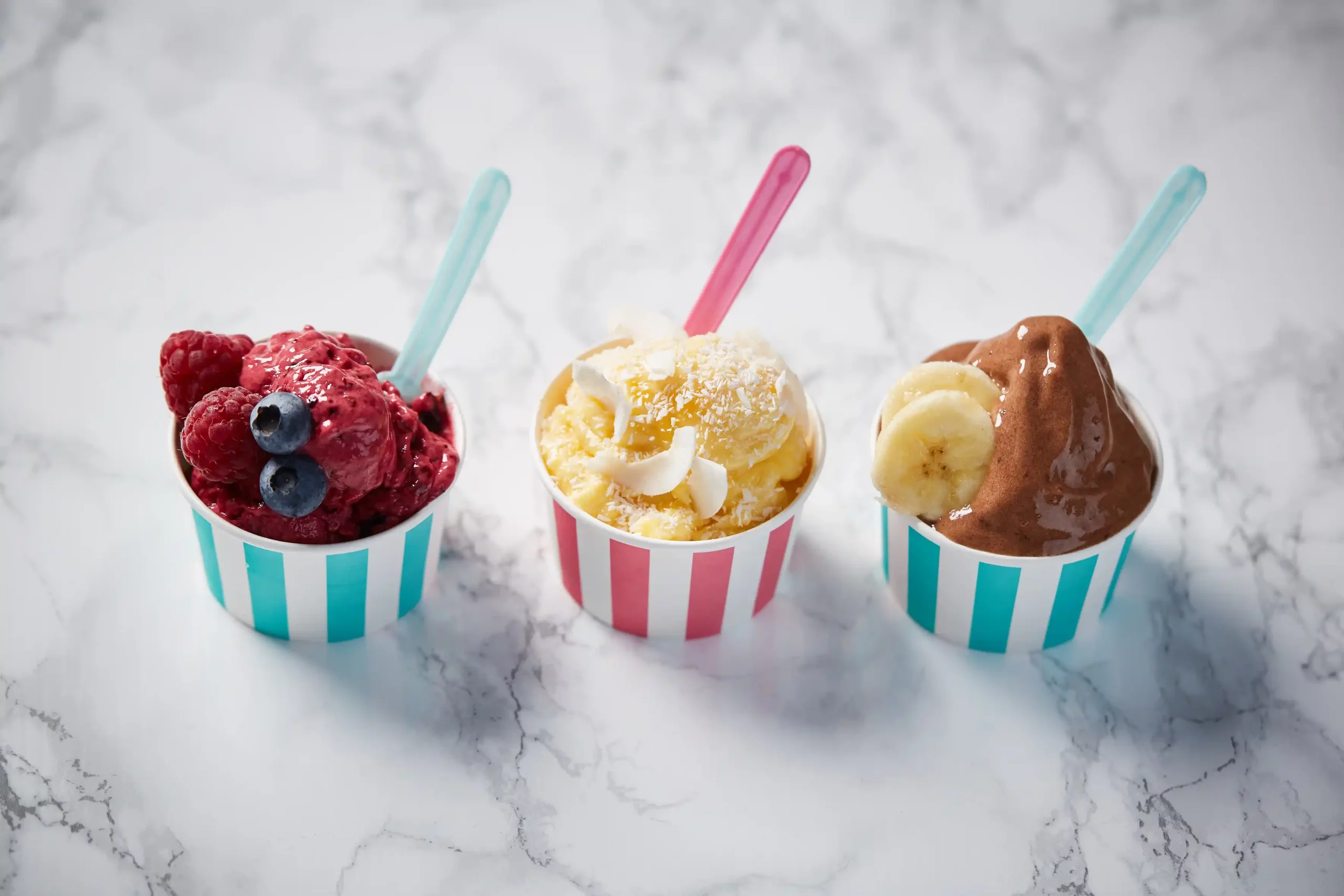 Natürlich könnt ihr eure Eissorten nach Lust und Laune mit Toppings verzieren. Ich habe mich für frisches Obst und Kokosstreusel entschieden. Aber eurer Fantasie sind keine Grenzen gesetzt – wichtig ist nur, dass ihr euer gesundes Eis dann nicht mit ungesunden Zutaten toppt. 😉