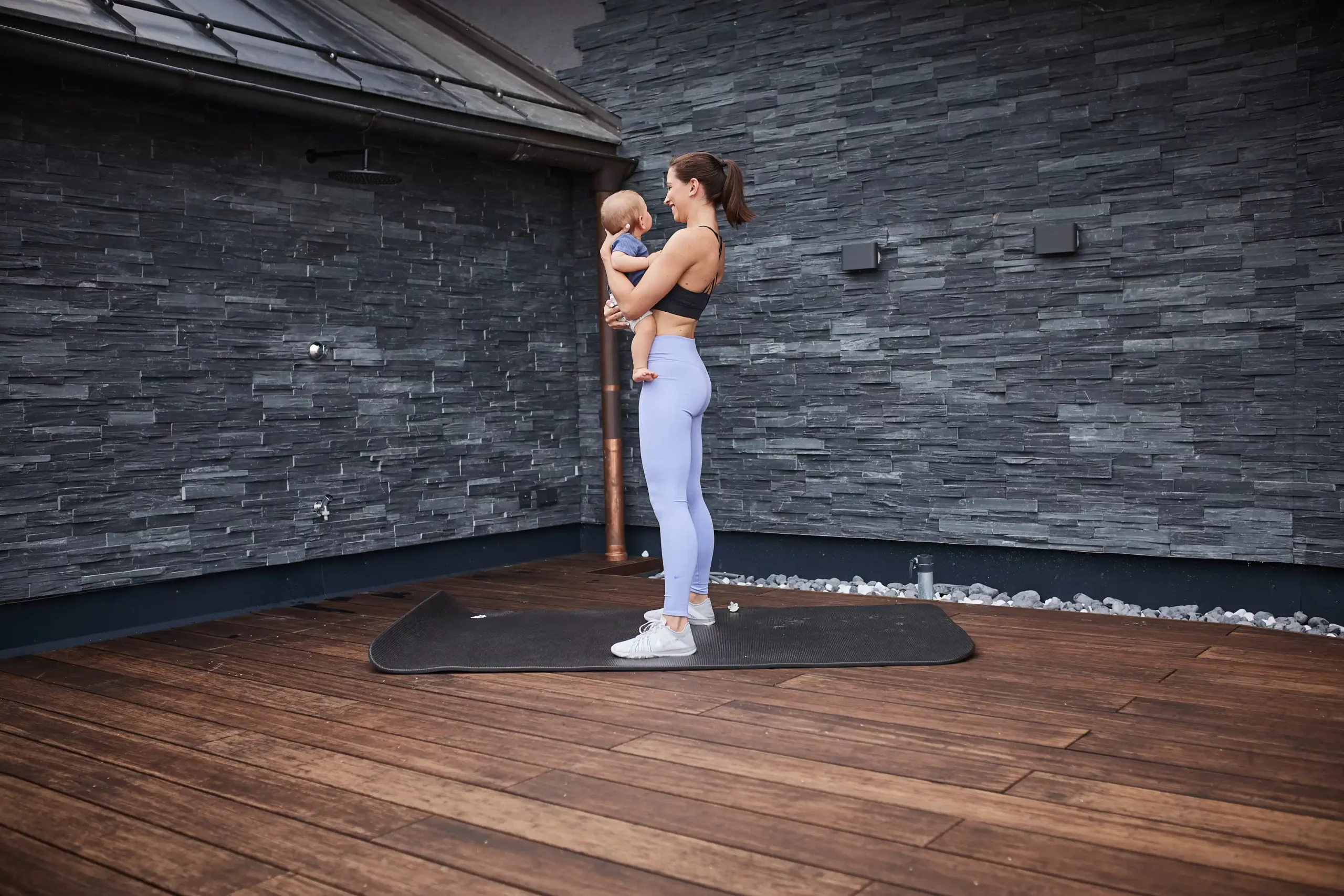 Als nächstes begebt euch in einen Einbeinstand, baut Spannung im Rumpf auf und hebt ein Bein nach vorne, zur Seite sowie nach hinten an. Diese Bewegungsabfolge macht ihr pro Bein 10x. Der Oberkörper bleibt dabei aufrecht. Durch das zusätzliche Halten vom Baby wird jede Übung gleich nochmal intensiver.