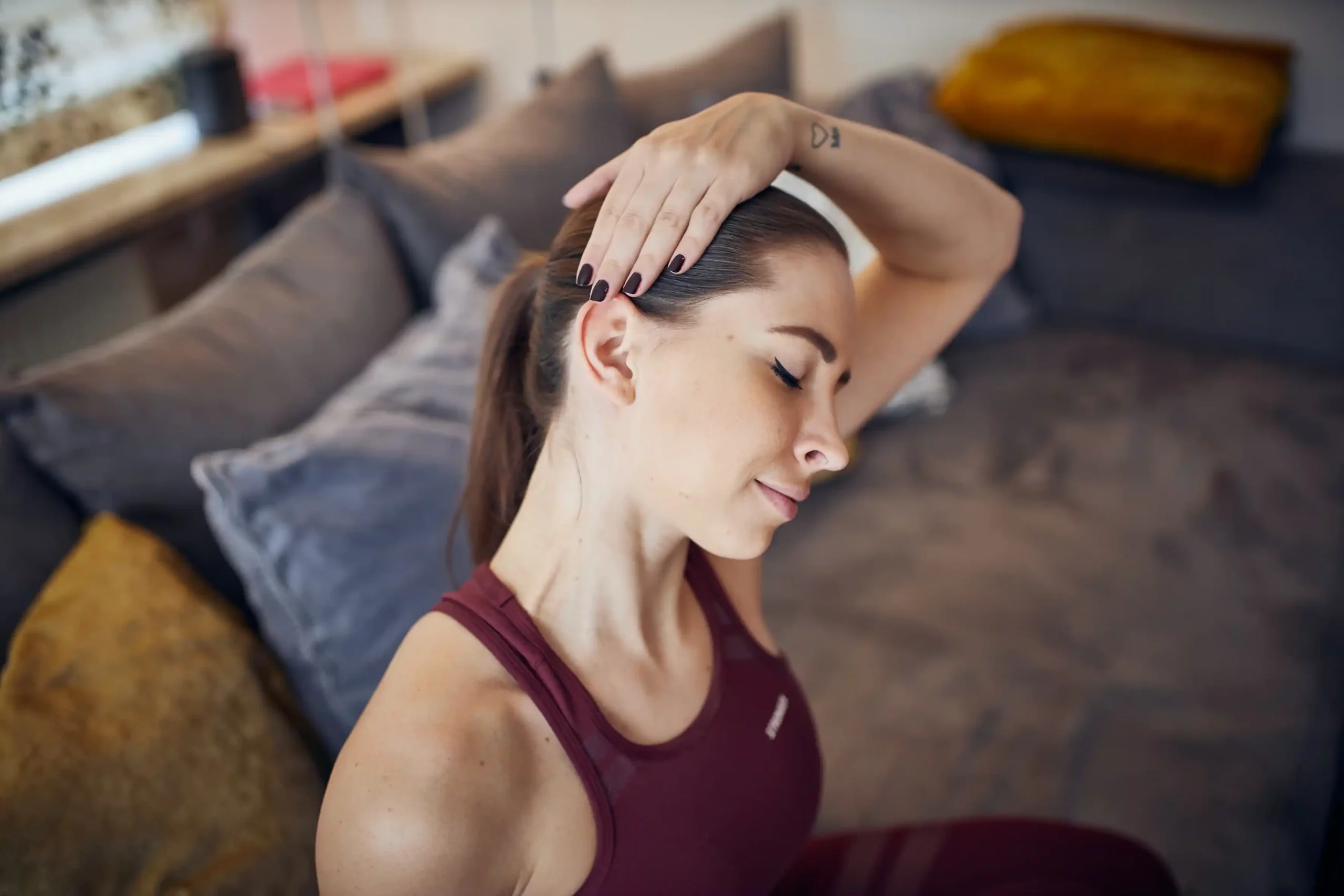 Greift mit eurem Arm diagonal auf die Schläfe und zieht den Kopf ganz vorsichtig zur Seite. Gerade bei der Nackenmuskulatur solltet ihr immer vorsichtig dehnen. (nur nicht zu ruckartig) Haltet die Dehnung für 30-60 Sekunden und wechselt danach zur anderen Seite.