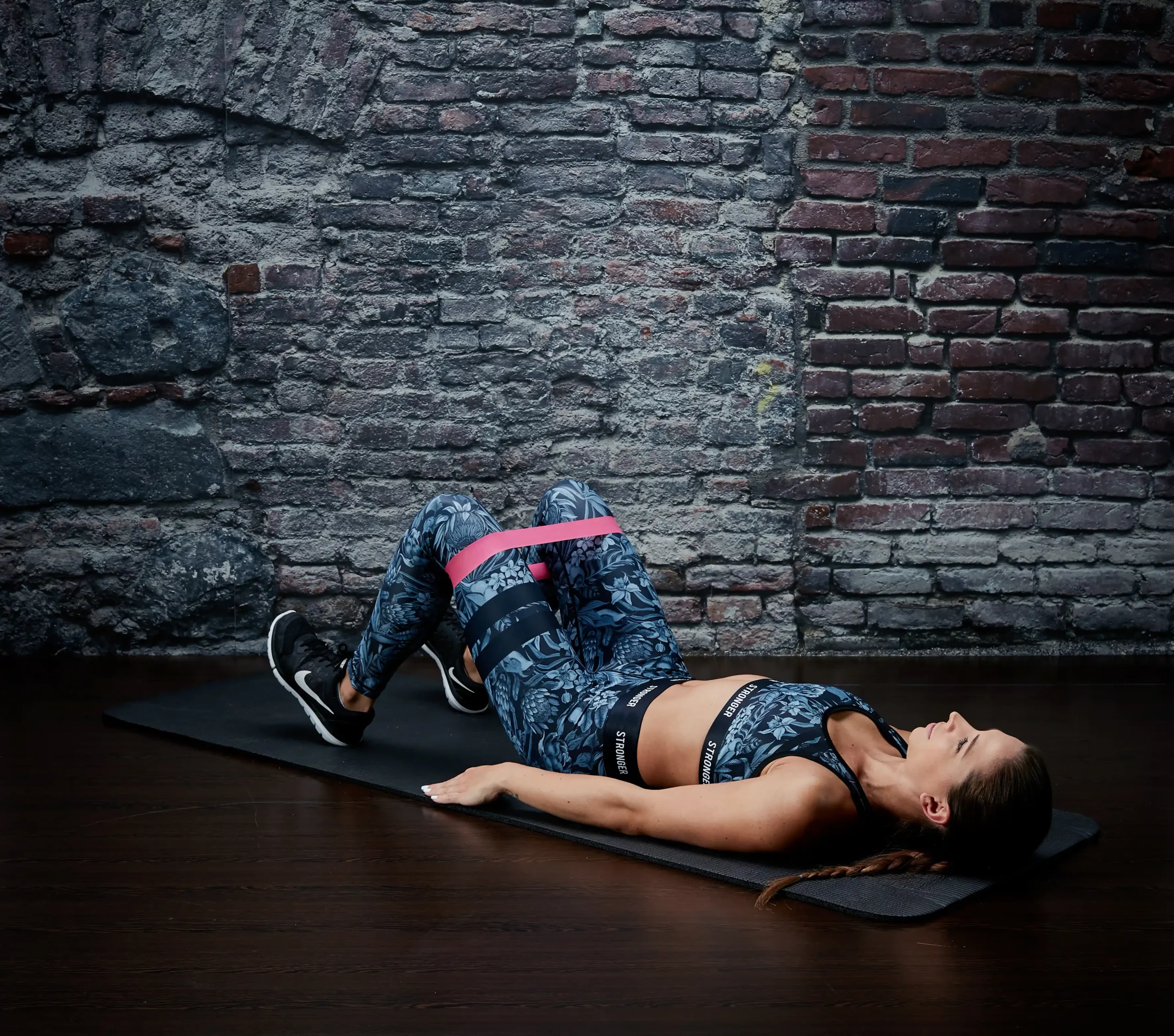 Ausgangsposition wieder in der Rückenlage, die Beine sind angewinkelt und die Fersen werden fest in den Boden gedrückt. Das Band wird oberhalb der Knie angelegt. Nun wird das Becken langsam angehoben und wieder (bis knapp über den Boden) gesenkt. Die Knie ziehen zusätzlich nach Außen, sodass das Band wieder unter Spannung ist.